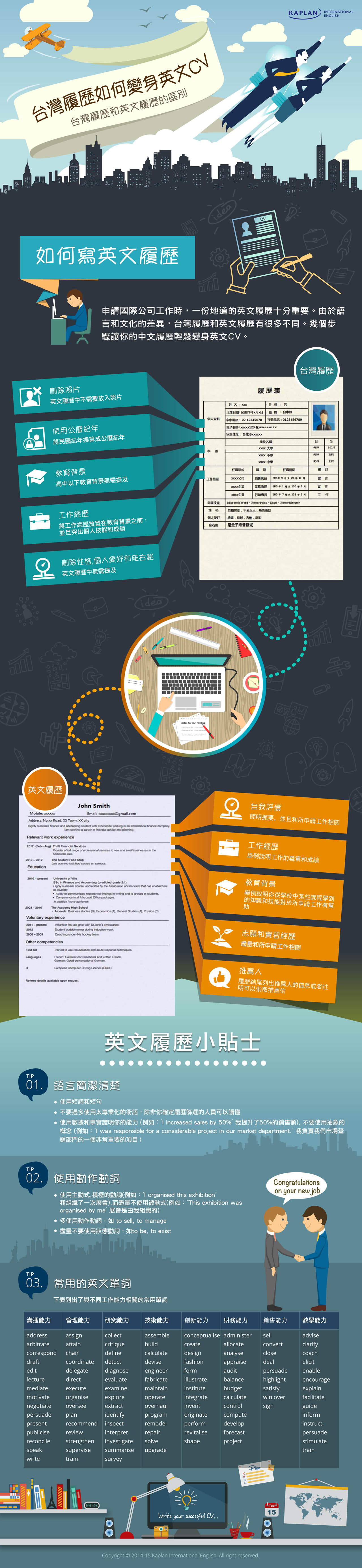 閱讀下面的信息圖,教你幾個小撇步輕鬆將台灣履歷化身地道英文CV。查看大圖。